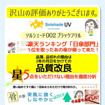 規格(solshade001) 親骨サイズ:50cm 骨の本数:8本 使用時サイズ(直径×全長):約95(フリル部含)×58.5cm 収納時サイズ(直径×全長):約7×28.5cm 重量:204g 傘布:ポリエステル100% 【規格】(solshade002) 親骨サイズ:約55cm 使用時サイズ(直径×全長):約100(フリル部含)×55cm 収納時サイズ(直径×全長):約5×24cm 重量:約243g 素材:グラスファイバー 傘布:ポリエステル100% 【規格】(solshade003) 親骨サイズ:約55cm 骨の本数:6本 使用時サイズ(直径×全長):約95×56cm 収納時サイズ(直径×全長):約5.2×25cm 重量:約210g 素材:グラスファイバー 傘布:ポリエステル100% MADE IN CHINA 【使用上のご注意】 ・製品には露先など尖った部分があるため、傘を開くときは周囲の安全を確認してください。