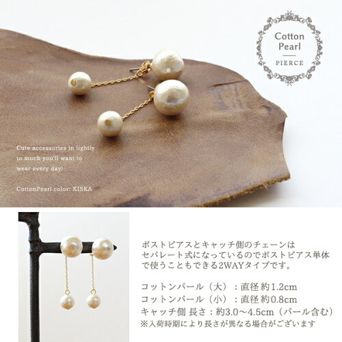 ■□ Item information - 商品説明 - □■ 大粒の12mm玉とチェーン付きの8mm玉が組み合わさったセパレートタイプのコットンパールピアスです。